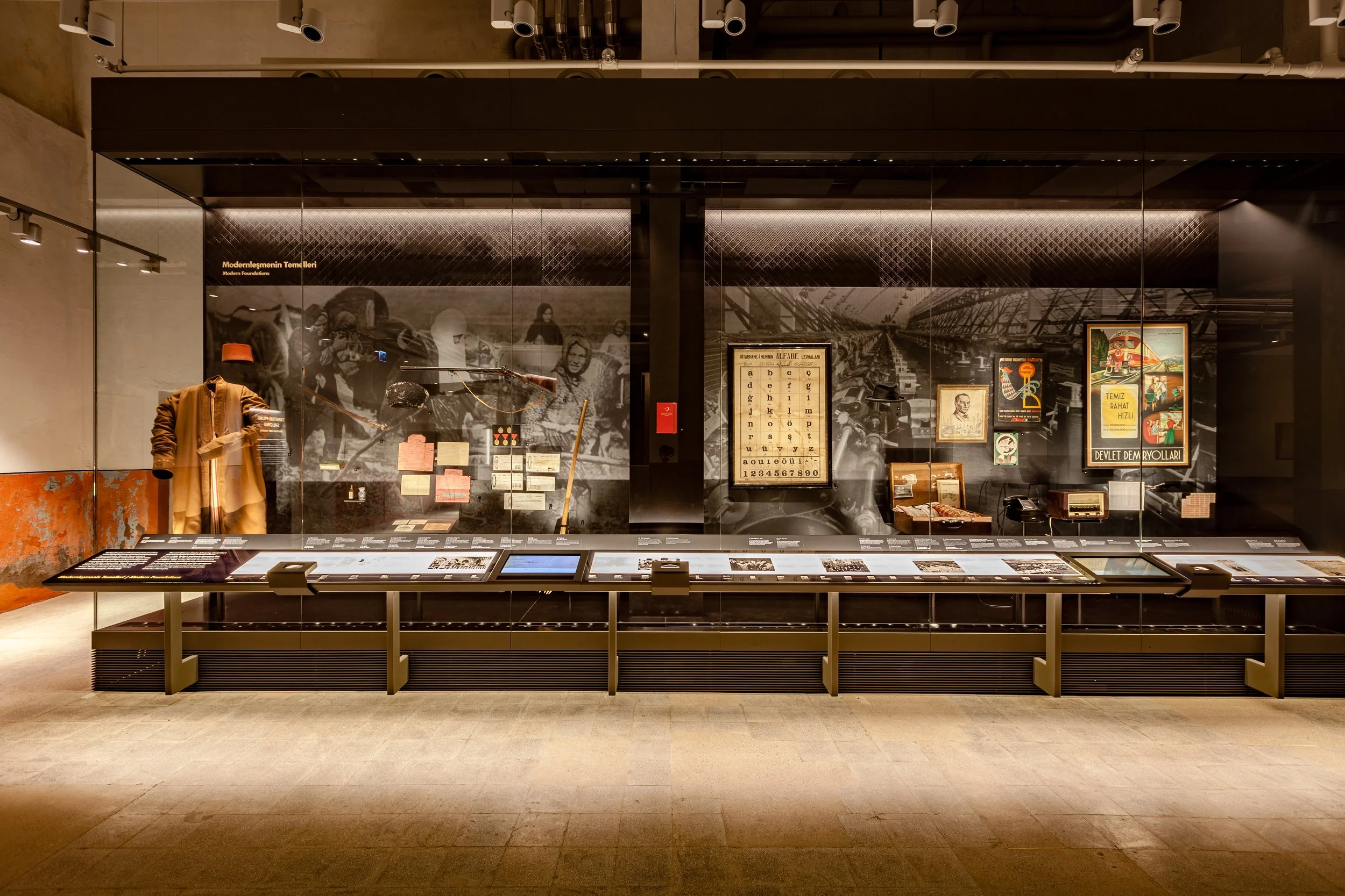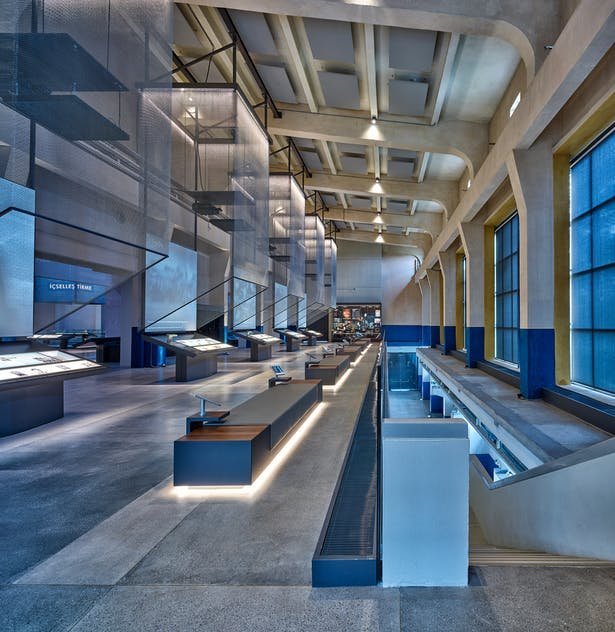 The exhibition took its visual cues from the turbines that had been removed from the empty powerstation. The turbines were replaced by five experiential stations dedicated to the five decades after the second world war that shaped modern Turkish politics. Each station used a mixture of still photography and a collage of period media to convey impressions of each decade. Sound domes engaged visitors in the sound of an era as well as the documentary film footage highlighting the major events.